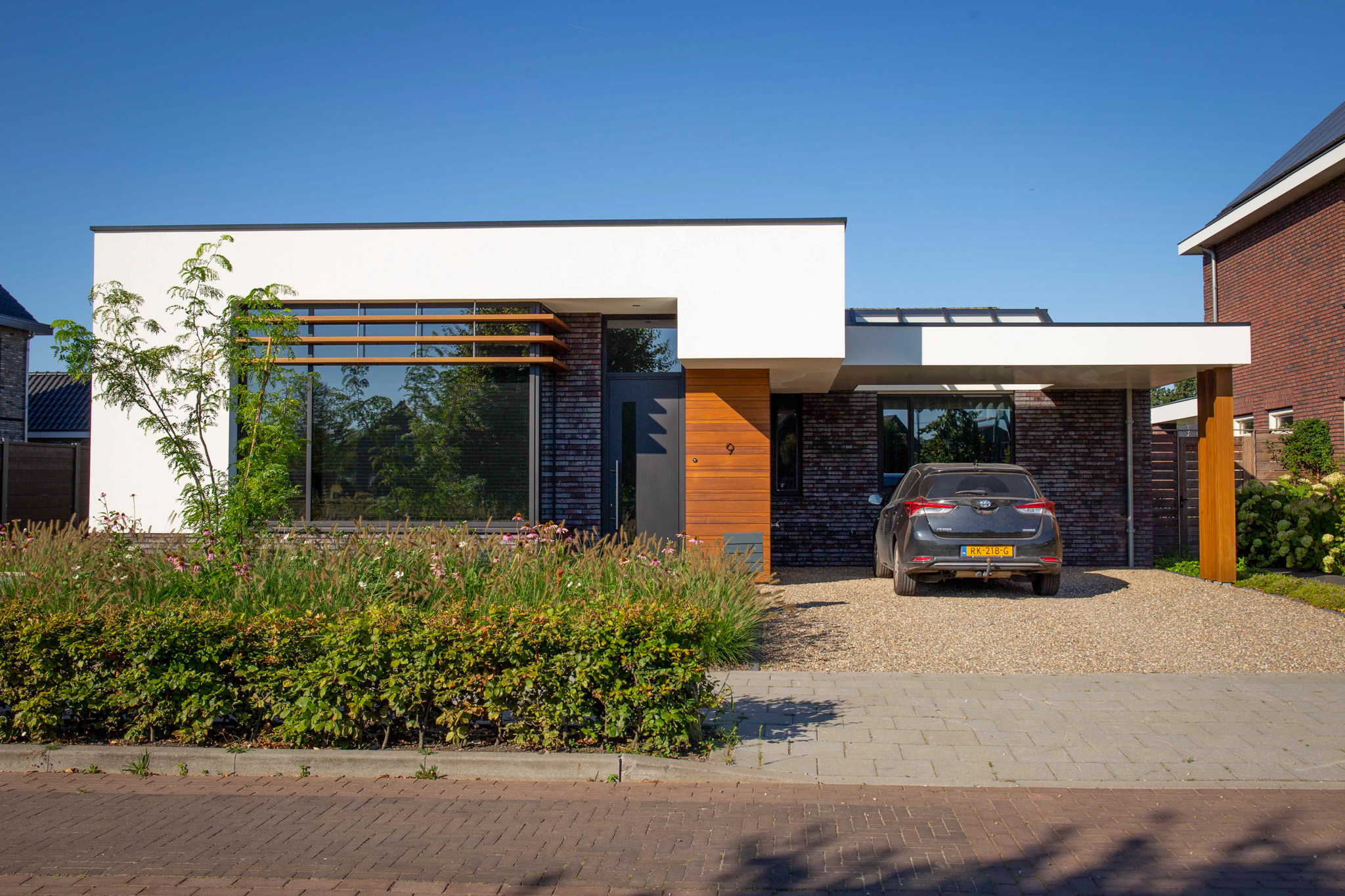 Voor dit project realiseerden we een moderne bungalow met strak gevelstucwerk en een heldere, horizontale vormentaal. De combinatie van grote gevelopeningen, hoogwaardige afwerking en een zorgvuldige materiaalkeuze zorgt voor een eigentijdse uitstraling en een comfortabele woonomgeving.