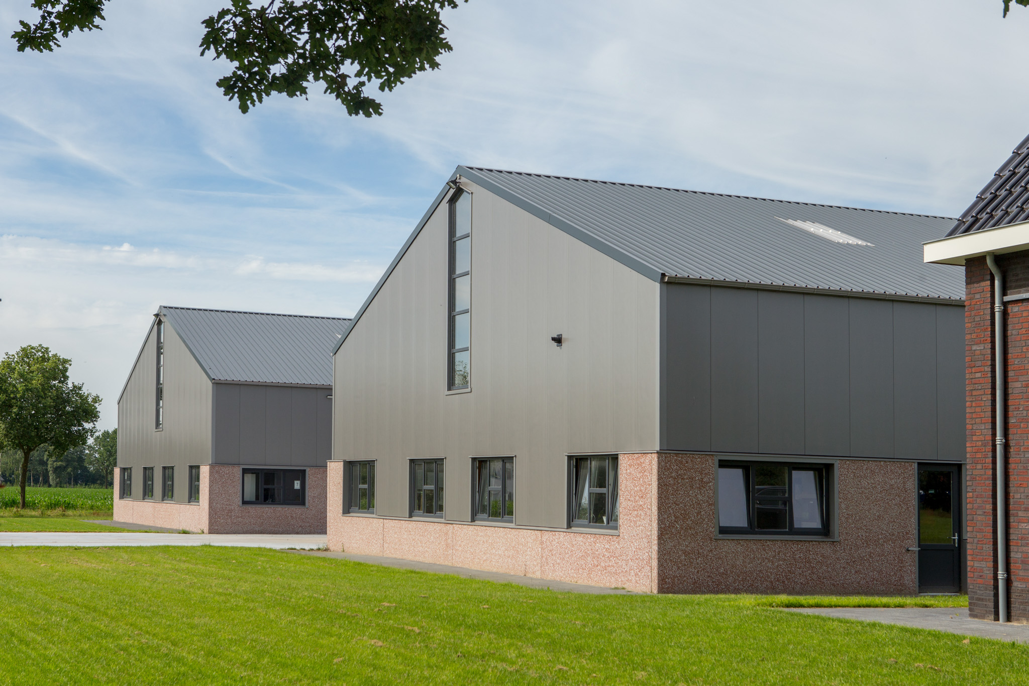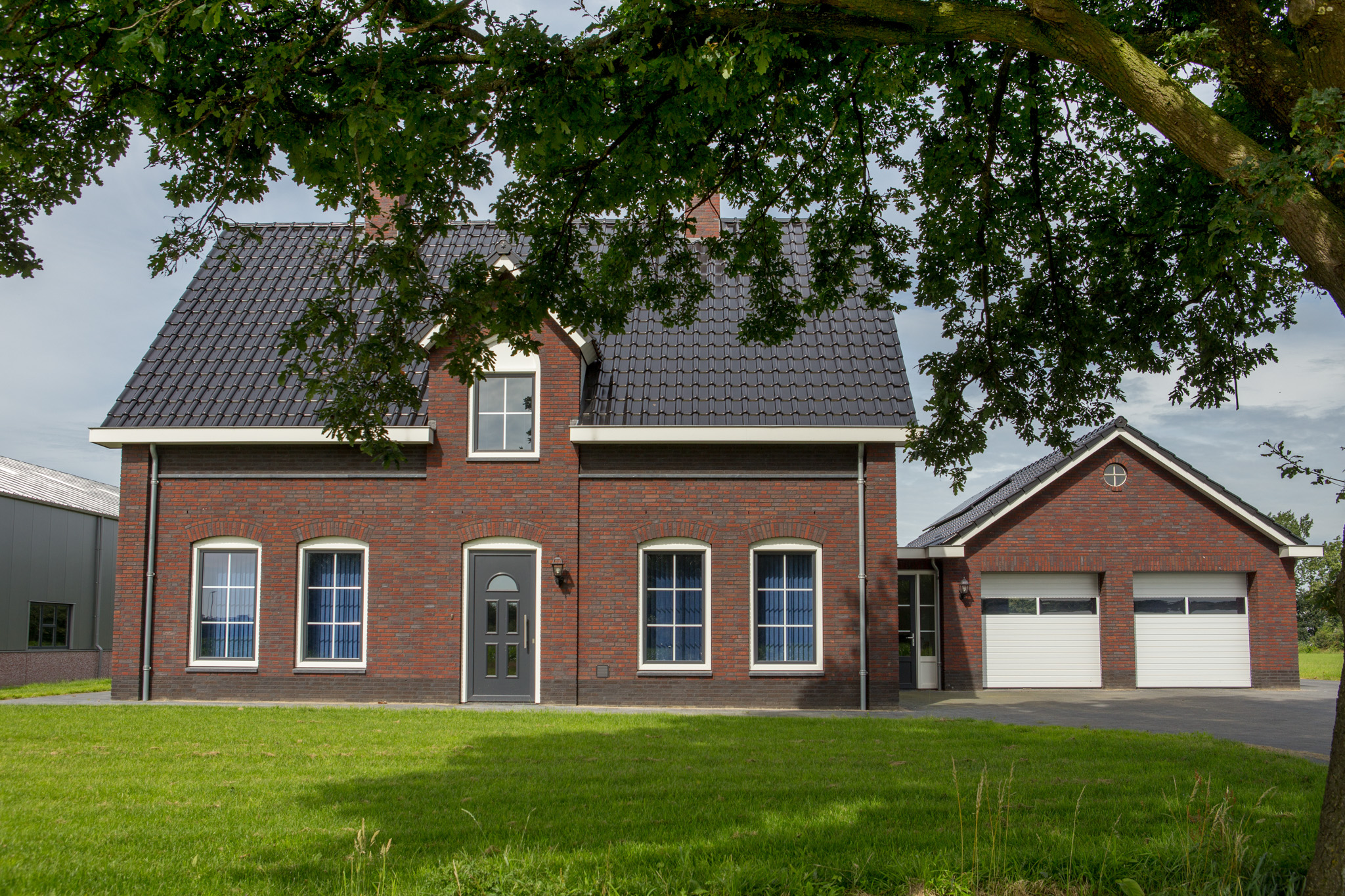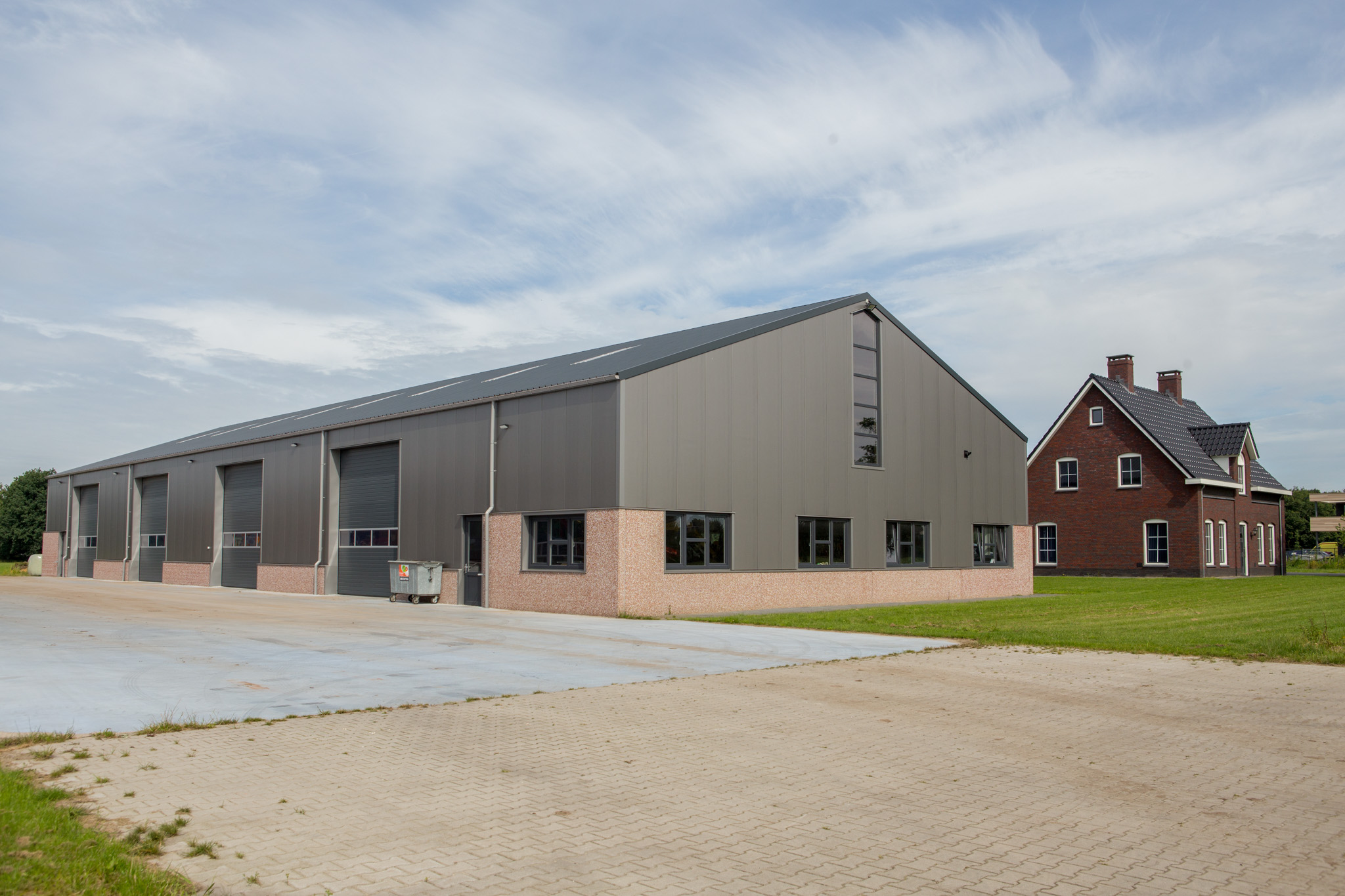 In Uden realiseerden we een compleet nieuwbouwproject bestaande uit een representatief woonhuis en twee ruime bedrijfsgebouwen. De woning is uitgevoerd in een klassieke stijl met hoogwaardig metselwerk, karakteristieke gevelopeningen en een zorgvuldig gedetailleerde kap. De naastgelegen opslaghallen zijn opgebouwd uit duurzame materialen en bieden efficiënte, toekomstbestendige bedrijfsruimten.